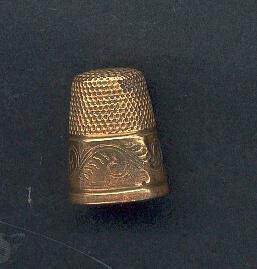 Brass thimble, no rim. Narrow plain band at rim. Wide band of feather pattern above. then knurling to and over top. No marks.