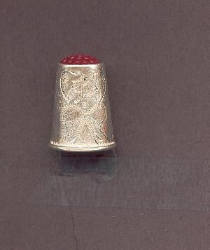 Silver thimble with rolled rim. Cornelian - red - stone top. Zigzag pattern of heart with initials inside - J A K? - canÕt really read them. Bow and streamers below.Stamped 830S above rim also CVC ?Inside gold wash.