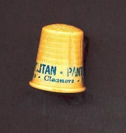 Plastic Advertising thimble, gold colour = darker gold than picture.Rolled rim. Green printing on band ÒMetropolitan Pantorium Launderers - Cleaners- Furriers*Ó Inside apex B&B St.Paul U.S.A.