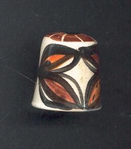 Large cream coloured china thimble with Tapa cloth pattern in shades of brown and black. Glazed inside but bottom of thimble is unglazed.No marks,
