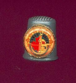 Souvenir thimble,grey, very heavy with added brass disc. Large, fluted at rim, vertical lines 1/2way up thimble. Indentations on top. Map of N.B., curling stone and broom on disc.brass outside, plastic with red, blue and white design.ÓLabatt Brier Canadian Curling Championship, Moncton Ô85Ó