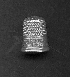 Silver thimble with rolled rim. Wide band of zigzag pattern with English hallmarks. 8 - size, CH - maker Charles Horner , Chester, and I -date mark for 1909