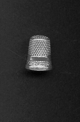 Silver thimble with facetted rim and narrow floral band above. plain narrow band with size marked on it, then knurling to and over top. Inside Ketcham and McDougall logo 8 and Sterling.Abstract design on an utilitarian thimble.