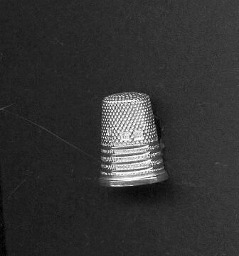 Silver thimble with raised rim. 4 band s of vertically cut lines with 4 plain bands between. Knurling to and over top. Stamped in knurling 4 - -Germany - 925 -- Sterling. Mark on top looks like logo of Lotthammer-Eber, Pforzheim, Germany.