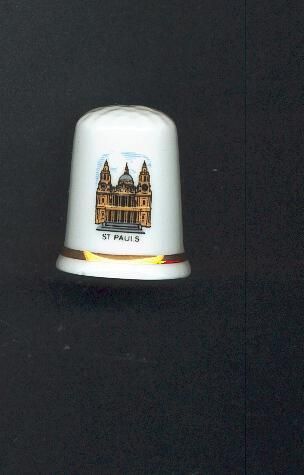 White glazed china Souvenir thimble, slightly fluted with a gold band at rim. Decal of St. PaulÕs Cathedral, London, Eng.. Faint signs of knurling on rounded top. Inside stamped in blue ÒKerrall Fine Bone China Staffordshie, EnglandÓ.