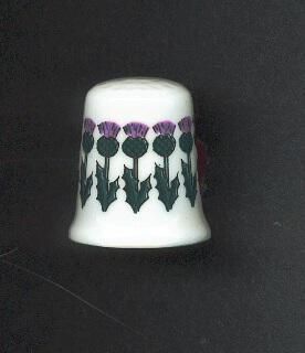 White glazed Soiuvenir pottery thimble, slightly fluted at rim. Green and purple thistles all around with ÒHolyroodÓ written in black. Stamped inside ÒSt. Andrews Pottery Scotland.