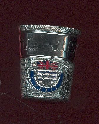 Souvenir drinking measure thimble. Nickel with narrow patterned rim. ÒJust * A * Thimble * Full * Ò on wide plain band. Knurling to top with a coloured crest iof B.C. and Trail in semi circle below crest. Stamped Made in England o on knurled top.