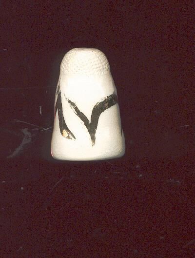 Cream coloured , partly glazed pottery thimble. Tall 1 1/2Ó with hand painted gold design - checks - around body. Conical shape. Unglazed mesh (Knurling) top. No marks.