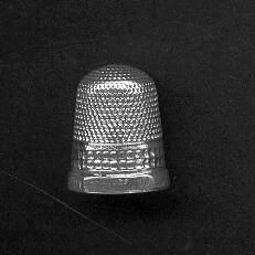 Siver thimble with rounded top. Raised rim with wide band of 2 rows of waffle pattern above rim. Eng;lish hallmarks on rim. Chester 1909 RD429537 size 8 Maker C? plus the printed word WilkersonKnurling to and over top.