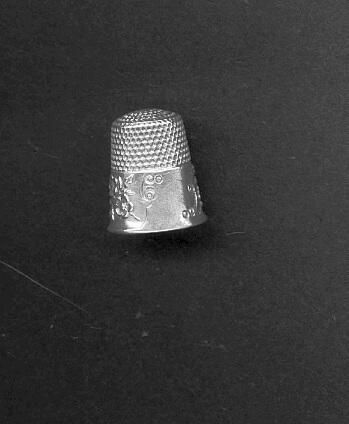 Silver thimble with slightly fluted rim. Wide band of pattern (1/2 thimble) Wild Rose pattern with Cartouche. Knurling to and over top. Inside apex has been altered- resilvered?.