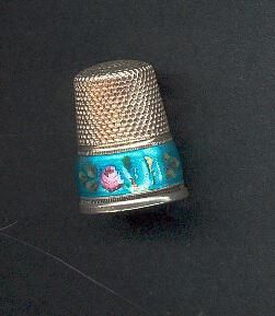 Silver thimble with narrow raised band. Wide enamelled band above - greenish- blue enamel background with roses and green leaves around. Pouncing from band to and over top with mark of Lotthammer- Eber in center top. Stamped in knurling 935 plus something that looks like a crown?.