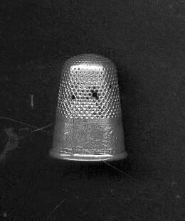 Tall silver thimble with raised band. Wide band of pattern - scallops or upside down CÕs above a narrow band of vertical lines - very worn. Knurling to and over top with holes. Two punch marks which I canÕt read.