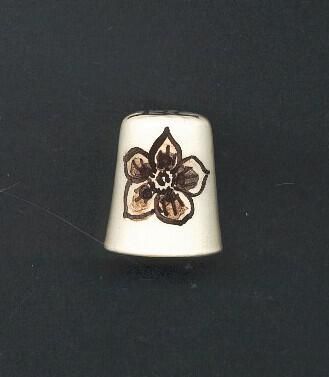 White, glazed pottery thimble with 5 petalled Dogwood flower,outlinedin dark brown on one side, brown petals other side. ÒB. C. on top of thimble which has faint signs of knurling. Signed inside ÒBy Corubbe VancouverÓ