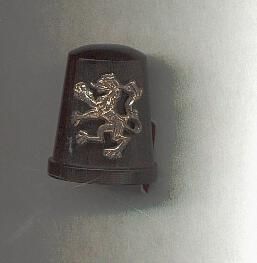 Blackwood thimble with raised rim. Sterling silver lion applied to body of thimble. No marks