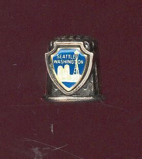 Pewter Souvenir thimble. Chunky with rolled rim. Applied crest in shield shape. Thimble and top both have indentations. Crest shows tall buildings and Space Needle with Seattle Washington.written. Colours in crest are blue, white and gold. Stamped Japan inside.