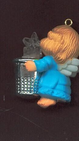 Hallmark Christmas Ornament for 1984 - 7th in series. Girl Angel with blue dress, gold hair carrying a silvrt colored metal thimble full of clear stars. Stamped on back HMK CDS. Hanger on top