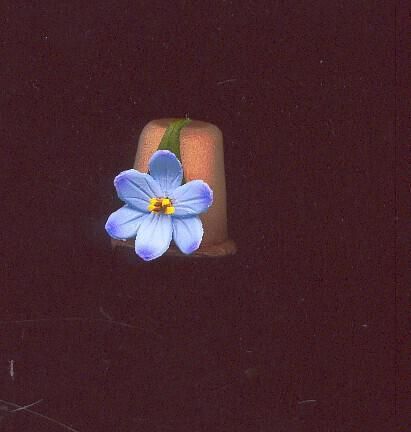 Leather Souvenir thimble. Light tan color with darker colour at fluted rim. Leather purple crocus with green leaf attached. Stamped Canada on back and also inside top.