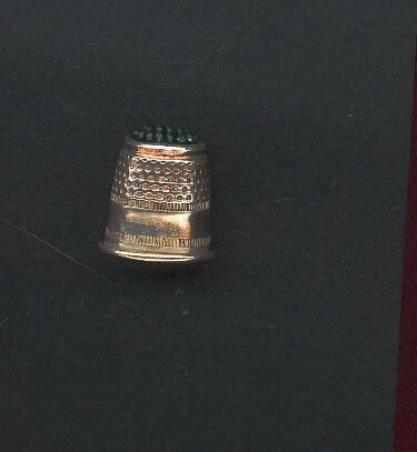 Silver thimble with rolled rim. Wide plain band above with 2 rows of vertical lines above and below. Stamped 900 on band. Squat shape. Moss agate stone in top with knurling. Stone unbacked. No marks