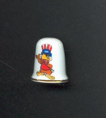 White glzed china Souvenir thimble with god band at rim. One side decal of animal dressed as YU.S.A. Other side black printing ÒGames of the XX!!!rd Olympiad Los Angeles 1984 Copyright 1980LAOOCÓInside paper label with Made in Japan on it.