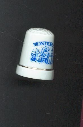 White glazed china thimble with wide rim. Line of gold between rim and thimble. Souvenir thimble. Decal of Thomas JeffersonÕs home ÒMonticelloÓ at Williamsburg, Virginia. No marks.