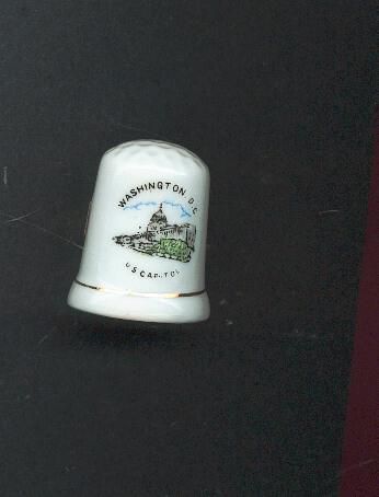 Wghiote china glazed Souvenir thimble, fluted with fine gold line at beginning of fluting. Decal of the Whitre Hou with the words ÒWashington D.C. U.S. Capitol Ò Paper label on back says Made in Taiwan. No other marks.