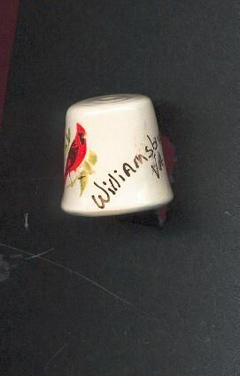 White glazed pottery Souvenir thimble. Squat shape ,flat top with circles around. Decal of Cardinal and ÒWilliamsburg, VAÓ in gold