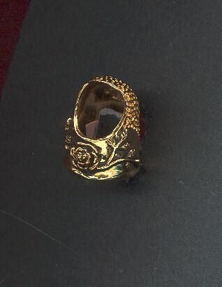 Gold plated finger guard. Raised design around of roses. Inside copyright Carol Bradley 1975 and ÒMÓ On back of guard in knurling is a cartouche.