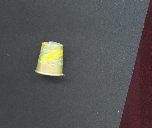 Mottled green ChildÕs thimble. Early plastic. Raised rim. Stamped Made in England in apex with a 9 or 6.