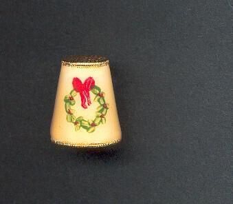 Gold plated brass thimble. Cream coloured lacquered on side with a green and red wreath one side, and green and red holly other side. Also 1974 below holly. Hand decorated. No marks. Knurling on flat top.
