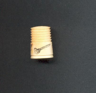 Cream coloured ivory, probably whale, thimble. Top has circles. Wide plain band with scrimshaw work - scissors, button,thimble, spool, needle with thread. Carved circular band above to top. No marks Blue paint or ink spot over part of design on band.
