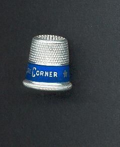 Aluminum Advertising thimble with rolled vertically lined rim.Wide blue band above with advertising ÒLittleShop Around The CornerÓ No marks.