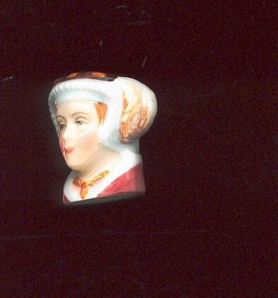White glazed china thimble in the shape of Katherine ParrÕs head. Hand painted, thimble indentations on top of brown hat.Francesco Art China made in Staffordshire, Eng. Inside head stamped Katherine Parr Staffordsshire, England and the artists initials ÒPA 84Ó