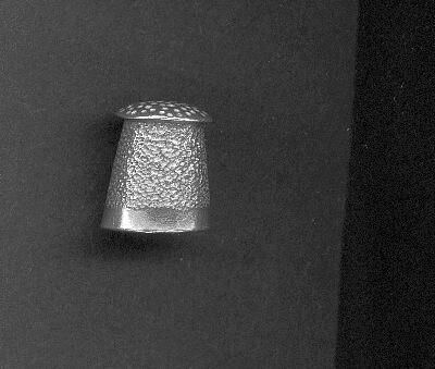 Pewter, polished, hand crafted thimble. Side seamed, top added with overlap. Hand punched on top. Irregular beaten sides. Stamped inside ÒPewterÓ