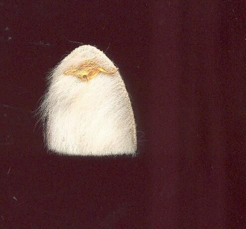 Kangaroo skin thimble with stick pin of a gilt colored metal kangaroo near top. Tea cozy shape. White belly fur.
