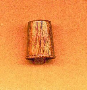 Wooden - bog oak - hand crafted thimble.Dark brown in colour with darker streaks. Rolled rim. No knurling. No marks. Label inside reads ÒMade by Geoffrey Manley Bog OakÓ