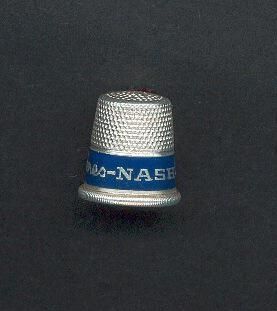 Aluminum Advertising thimble with lined rolled rim. Blue band above rim advertising Ò*James-Nash MotorsÓ Knurling from band to and over top. No marks.