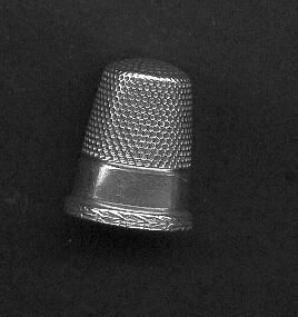 Nickel thimble with raised rim. Patter\n of horizontal vÕs around rim. Wide plain band above with 5/0 stamped in it. No other marks. Knurling from band to and over top. This is a very large thimble.