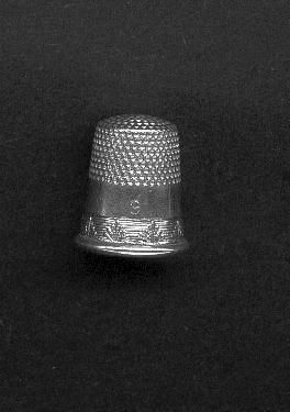 Nickel thimble with rolled rim. Narrow band of pattern above rim - palm leaf design.Wider plain band above pattern with size stamped on,then knurling to and over top.