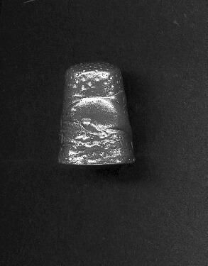 Pewter thimble, tall , side seamed. All around pattern of whales 2 large,1small from rim up to 2/3rds. Indentations from here to and over slightly rounded top. No marks,