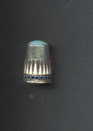 Silver thimble with Moonstone top. Rolled rim.Narrow band of blue, dark, enamelled circles above rim. Wider band of white enamelled vertical triangles. Plain to top, stone on top knurled. Marked in apex 930S and logo of David Anderson, Norway.