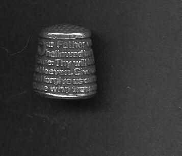 Pewter thimble, large, heavy, side seamed, slight raise at rim. The LordÕs Prayer is impressed around body of thimble. Background dark, prayer shiny. Inside stamped ÒPewter Made in EnglandÓ and 3 different marks;. one with a crown and initials L.A.P. one is two circles one inside the other and the third is one circle with triangle i nside and initials BPC.