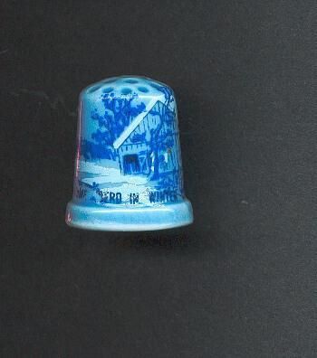 Largre blue g;lazed china thimble with scene of house, trees, snow. A Currier & Ives print of ÒThe Old Homestead in WinterÓ. Decal. Knurling on slightly rounded top. Raised rim