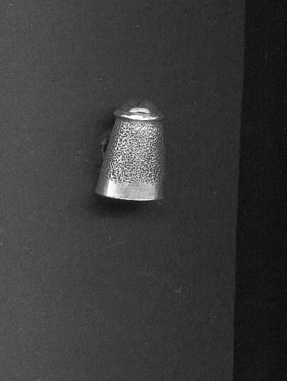 Hand crafted pewrter thimble with with rhodonite stone set in top.Side seamed. Hand hammered side with plain band at rim. No marks. r