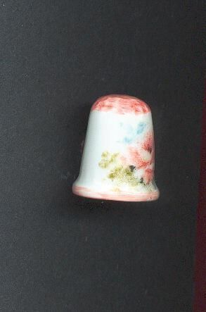 Hand painted china thimble. White glazed, slightly fluted at rim and rounded knurled top.Top and rim painted peach-pink colour. Side of thimble has peach-pink rose with green leaves. Signed J.W.