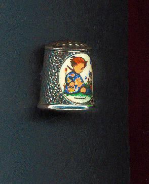 Silverplated Hummel limited edition thimble. Raised rim,side seamed, separate knurled top. Body of thimble has diamonds with dots allover except for colour disc and identification on back.Disc - coloured of Hummel figure. On back Ars edition1984 limited edition. Inside W.Germany Versilbert H Silverplated.