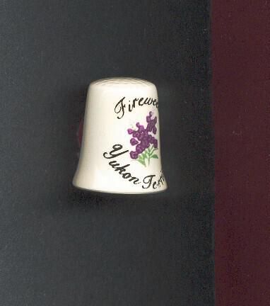 Souvenir pottery thimble, cream coloured, glazed. Coloured decal of purple flowers, green leaves with Fireweed Yukon in black above and below. No marks.