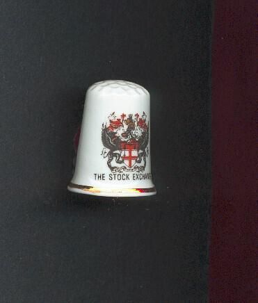 White bone china glazed thimble, fluted at rim. Gold band around rim. Decal added with the coat of arms of ÒThe Stock ExchamgeÓ.,and the words printed beneath. Stamped inside North Lodge Bone China Made in Britain.