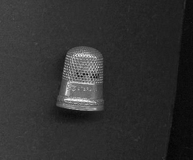 Silver thimble with raised narrow band of pattern above edge of thimble. Wide plain band above with marks - 9 (size) Fouled anchor (Goldsmith Stern - maker) and Sterling. Few holes in knurling from band to and over top.