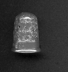 Sulver thimble with rolled rim.Wide plain band above with English hallmarks - 8 (size) CH (maker - Charles Horner) Chester 1881. All-over chrysanthenum pattern from band to and over top. Few holes around and slightly out of round.