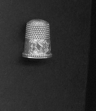 Silver thimble with beaded rim . Wide band of chased pattern -triangles and circles with a cartouche. Knurling from band to and over top. inside top Simon Bros. logo in shield with Sterling silver around it.Size (10) stamped in cartouche.